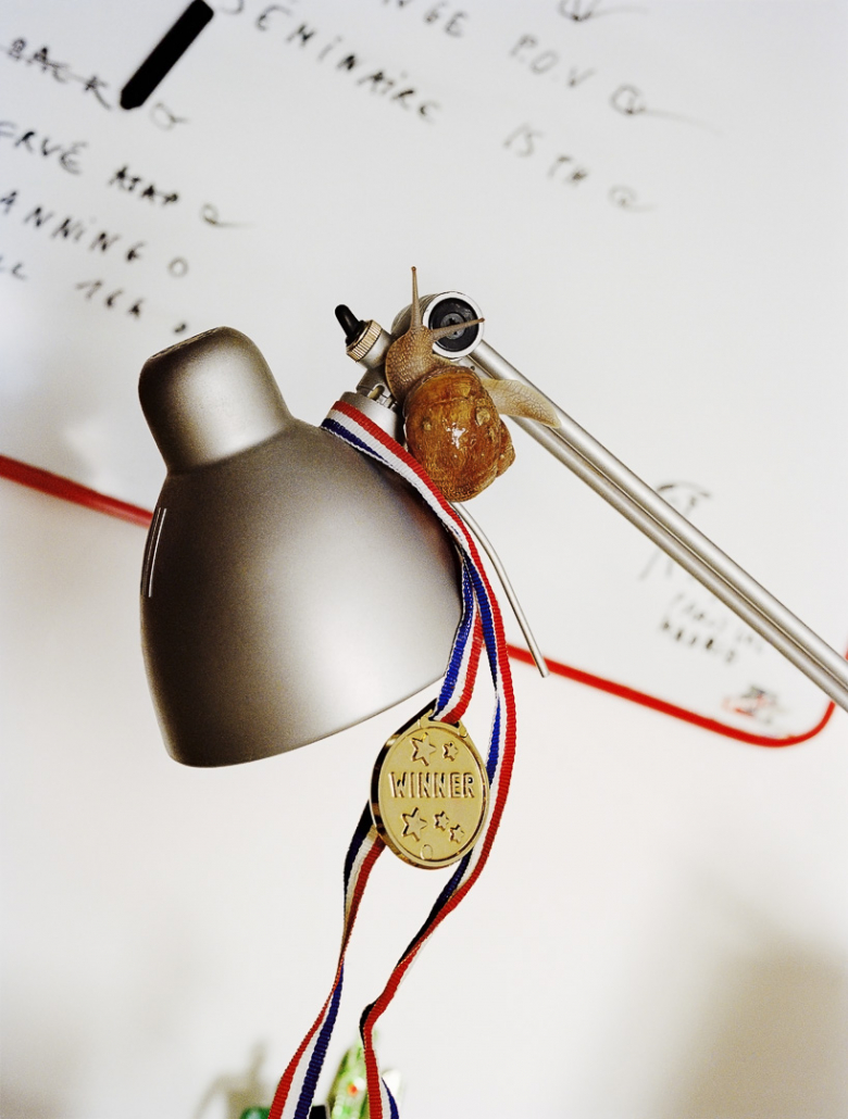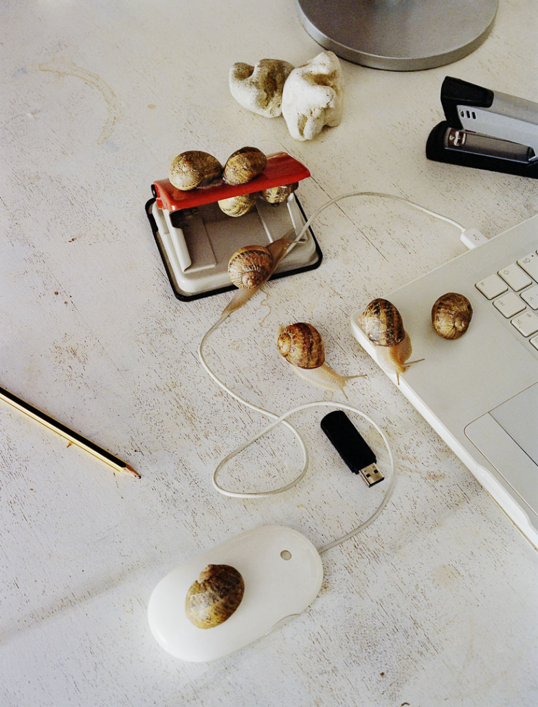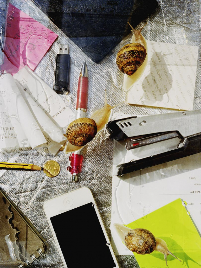 Finally, for the third and last exhibition, she summons in “Triumph” the bestiary of laziness, opposing the capital sin to the myths of work and performance. Her snails, invading an icy office universe, displace its functions: staplers, mice, screens become playgrounds, rockers, snail trees as cats have theirs. Laziness, as a reappropriation of a temporality of its own, becomes a form of emancipation, of lucidity, of resistance.