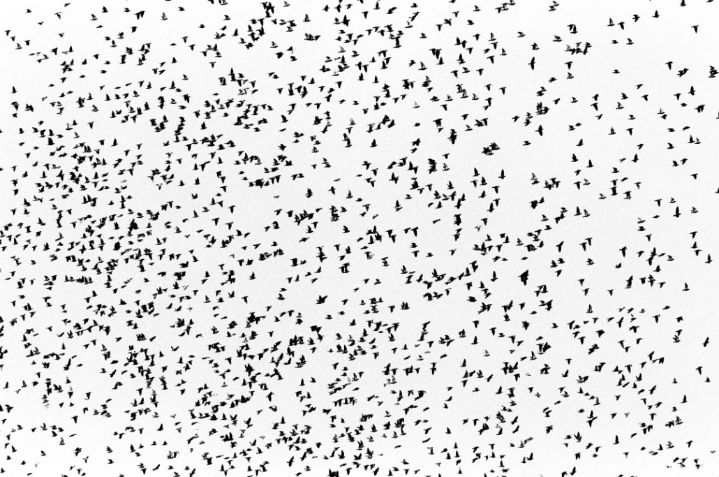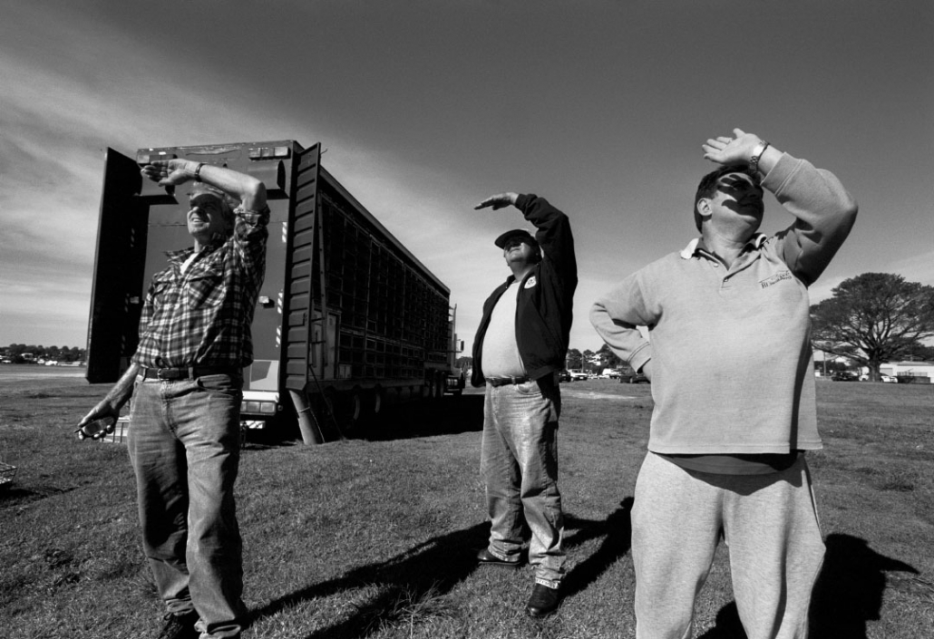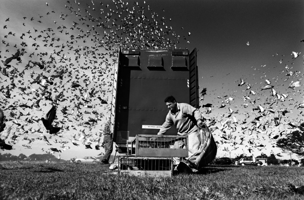Ce reportage tient surtout de la recherche esthétique. Suivre des milliers de pigeons lâchés depuis un camion semi-remorque, les regarder s’envoler jusqu’à devenir des petits points noirs à l’horizon. Steven Siewert capture ces volatiles et fige leurs ailes dans un noir et blanc délicat.
