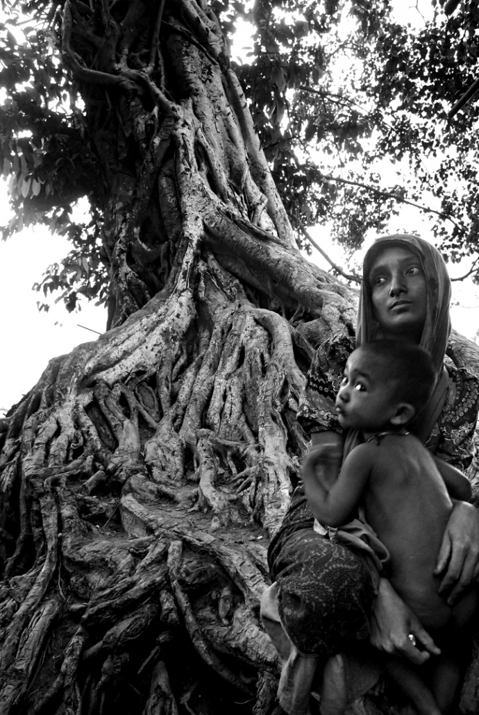 « Dark Water » est une série de photographies en noir et blanc qui semble inoffensive au premier abord : des masses d’eau sombres et sans traits – l’océan vide dans sa forme la plus ordinaire, un rappel brutal de ce que les Rohingyas ont traversé pour échapper à une exécution massive. Rappelant des détails déchirants, Wasif juxtapose des textes et des images pour révéler la fuite des réfugiés en mer. L’œuvre reflète le flux constant de migration dans la baie du Bengale, où les lignes de frontières se perdent dans les ombres de la nuit.